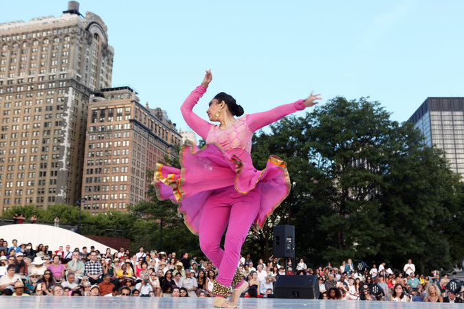 Because the Battery Dance Company always gives one day of its Downtown Dance Festival to the Erasing Borders Festival of Indian Dance (which is organized by the Indo-American Arts Council), the juxtaposition of the South Asian dances and the outdoor spaces of Lower Manhattan has become an August fixture. And since the Downtown Festival this year is taking place close to the water in the Robert F. Wagner Jr. Park, the setting ought to be more tourist-perfect than ever before.